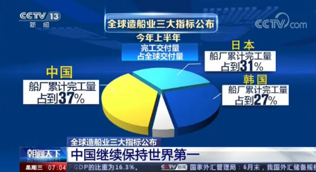 全球權(quán)威航運(yùn)造船機(jī)構(gòu)公布的最新數(shù)據(jù)顯示,今年上半年,全球造船業(yè)三大指標(biāo),中國再次領(lǐng)先,繼續(xù)保持世界第一的紀(jì)錄。