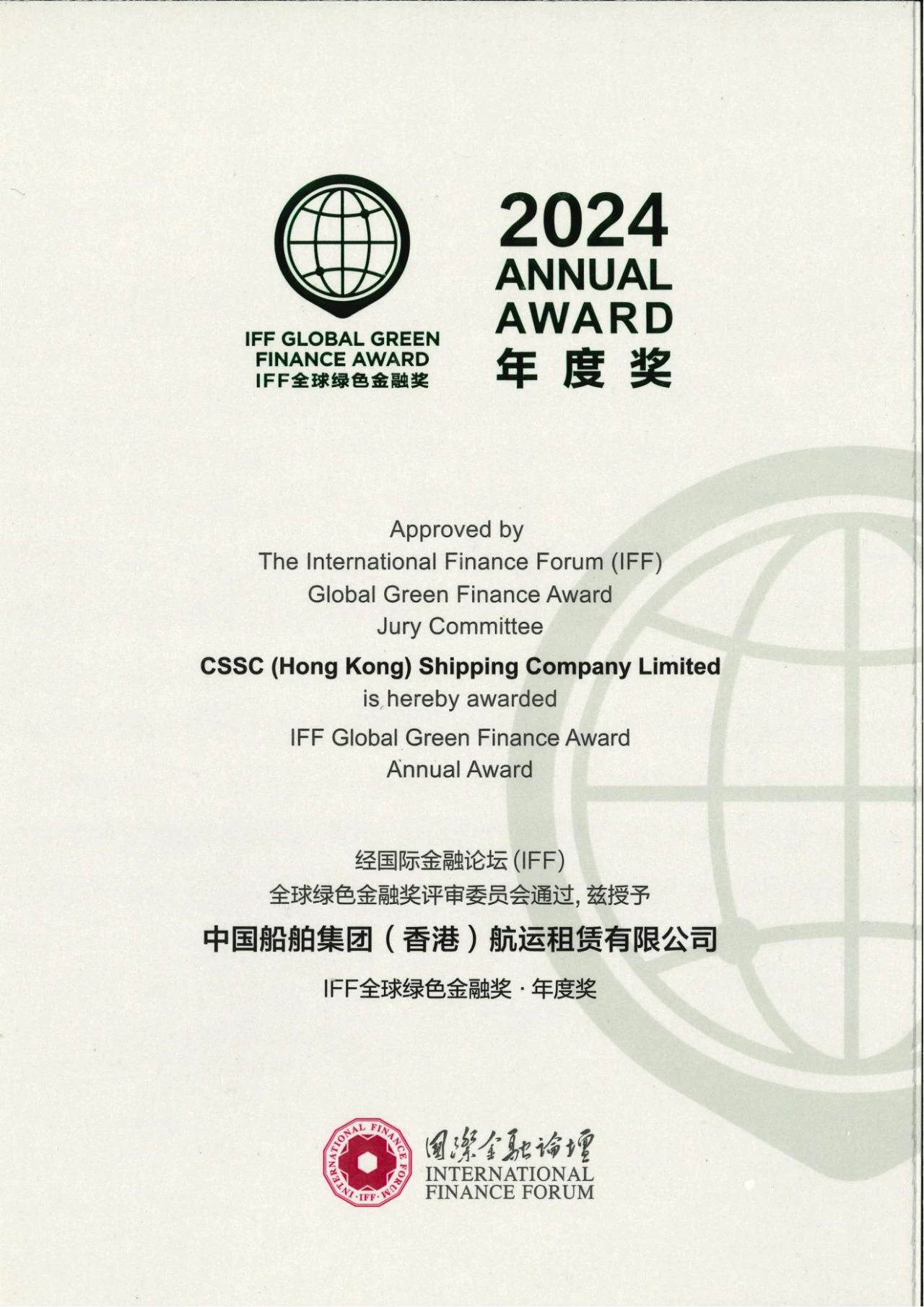 日前,在中國香港舉行的國際金融論壇(IFF)第21屆全球年會(huì)(F20峰會(huì))上,發(fā)布了第五屆“IFF全球綠色金融獎(jiǎng)”評(píng)選結(jié)果。中國船舶集團(tuán)中船租賃憑借其在綠色金融領(lǐng)域綜合實(shí)踐的杰出表現(xiàn),首度榮膺“IFF全球綠色金融獎(jiǎng)——年度獎(jiǎng)”。這是繼2021年獲得“IFF全球綠色金融創(chuàng)新獎(jiǎng)”,中船租賃再上一層樓,榮獲年度大獎(jiǎng)。