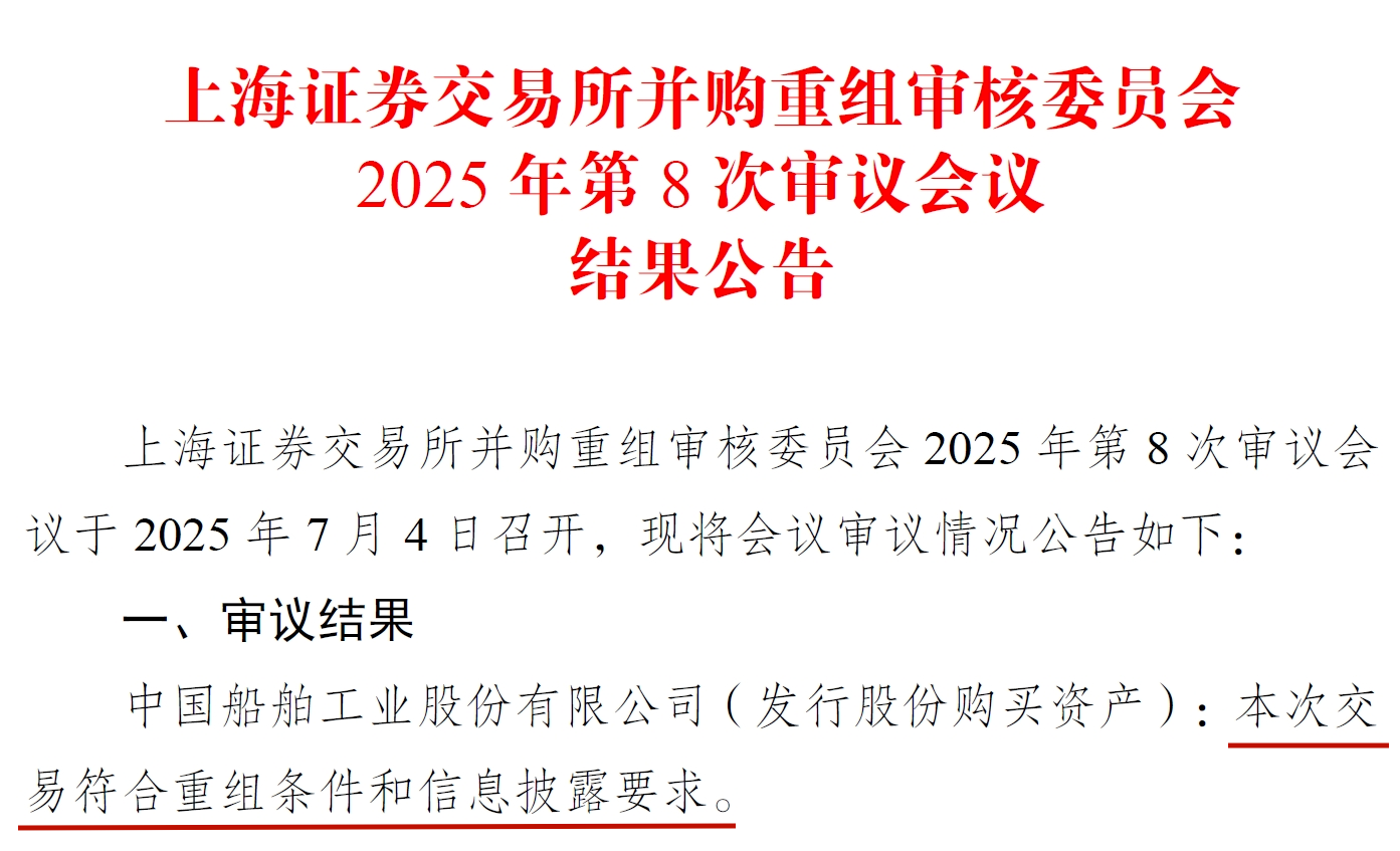 7月4日,上海證券交易所并購重組審核委員會2025年第8次審議會議召開,審議結果為中國船舶工業(yè)股份有限公司(發(fā)行股份購買資產):本次交易符合重組條件和信息披露要求。