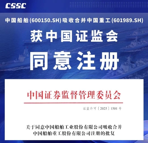 7月18日,中國(guó)證監(jiān)會(huì)發(fā)布《關(guān)于同意中國(guó)船舶工業(yè)股份有限公司吸收合并中國(guó)船舶重工股份有限公司注冊(cè)的批復(fù)》,同意中國(guó)船舶工業(yè)股份有限公司換股吸收合并中國(guó)船舶重工股份有限公司。