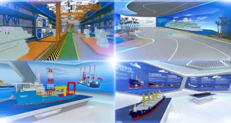 云展廳運用360度全景3D建模、沉浸式場景以及實時渲染等領先創(chuàng)新技術,打造了高端3A(“Anybody、Anytime、Anywhere”)展示平臺,特別是以實景還原的場景,動態(tài)展示大型郵輪、液化天然氣(LNG)船、雪龍2號、奮斗者號等亮點產(chǎn)品,為參觀者營造了身臨其境的逼真效果。