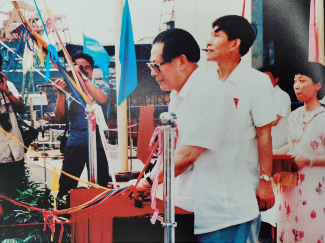 1986年,江澤民同志為江南造船65000噸原油輪“柳河”號(hào)下水剪彩。