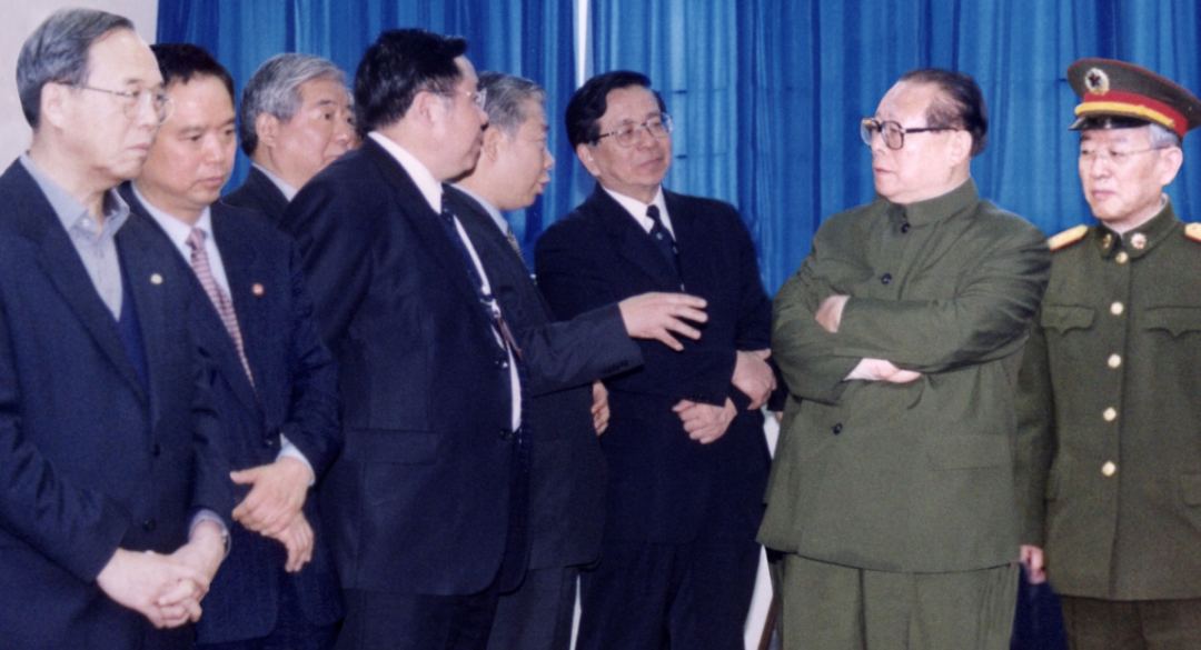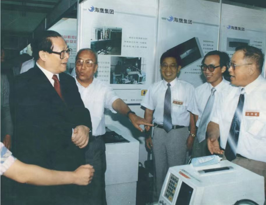 江澤民同志曾參觀系統(tǒng)工程研究院、中船電科旗下海鷹公司產(chǎn)品。圖為1995年,江澤民同志參觀海鷹公司展臺(tái)。