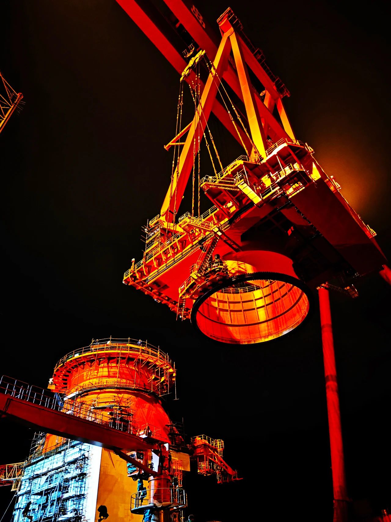 在武漢船機(jī)平臺總裝現(xiàn)場,華夏金租神大平臺配套的1200噸起重機(jī)正在安裝,大件吊裝各項(xiàng)準(zhǔn)備工作繁瑣,一切就緒時(shí),天已經(jīng)黑了,現(xiàn)場一鼓作氣開始吊裝對接,展現(xiàn)了船舶人只爭朝夕、不負(fù)韶華、忘我工作精神風(fēng)貌。