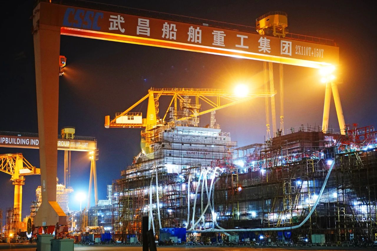 照片攝于國產(chǎn)首艘大型郵輪首次出塢前夕,拍攝時(shí)期為傍晚,船塢開啟燈光照明,工人在對船身做最后的涂裝修飾工作。這樣的角度觀看國產(chǎn)首艘大型郵輪令人無比震撼。