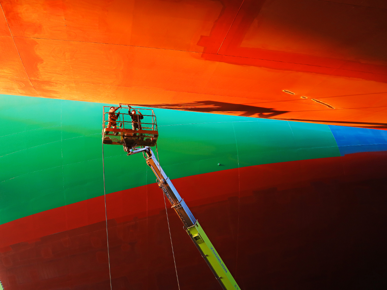 兩位打磨工人駕駛高空車對(duì)外板進(jìn)行清潔施工,這個(gè)瞬間,他們?nèi)缤蒙碛谕挳?dāng)于一般。