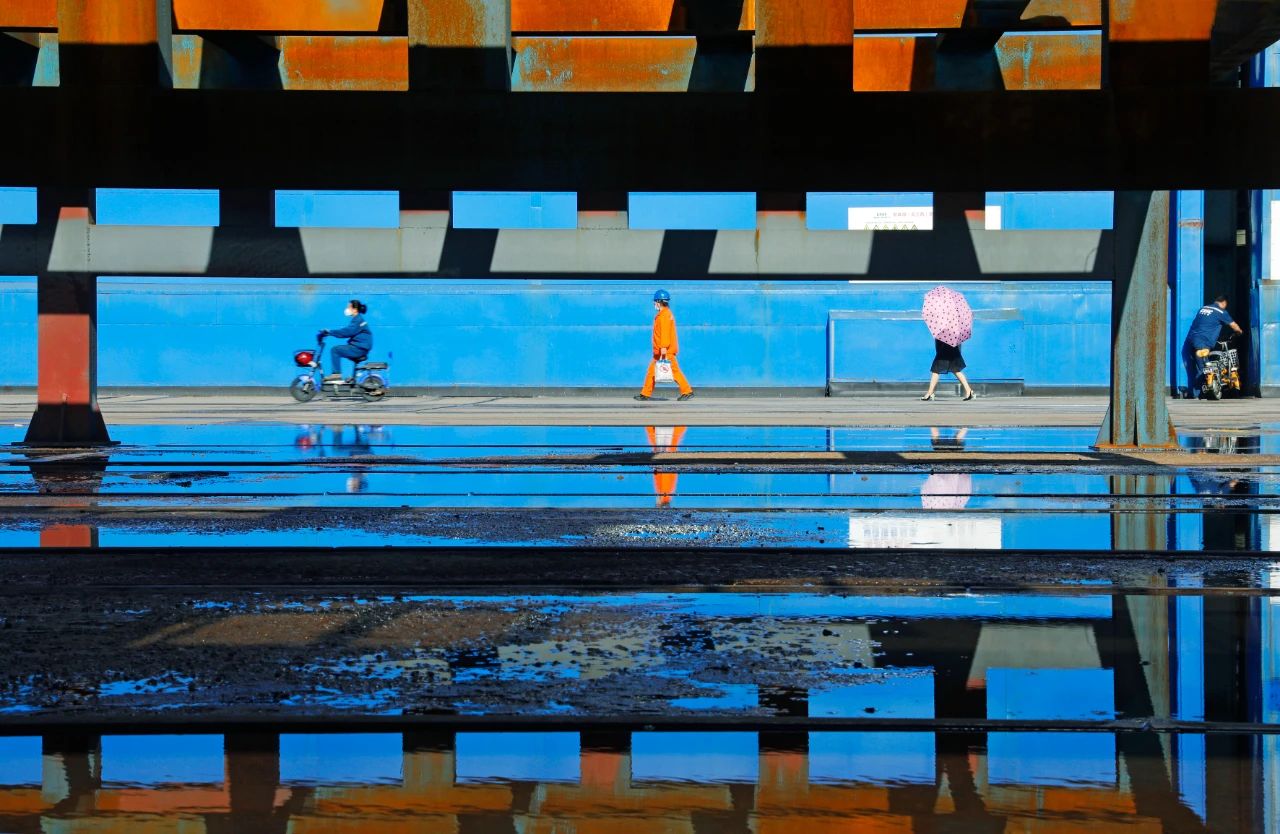 夏日清晨,一場(chǎng)大雨過(guò)后空氣透亮清新,廠區(qū)高跨門口服裝各異的職工行走在上班的路上,空地上擺放的工裝架與其自身的投影形成了獨(dú)特的畫框,讓畫面中行走的職工雖小卻很突出,起重工亮橙色的服裝、撐起的雨傘與明亮的藍(lán)色跨門形成色彩對(duì)比,使畫面活潑跳躍,職工們形形色色又從容有序,勾勒出廠區(qū)一隅的美麗風(fēng)景。