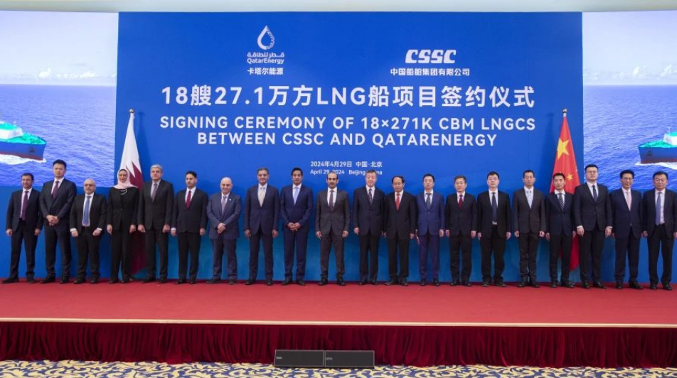 4月29日,中國船舶集團(tuán)有限公司與卡塔爾能源在京舉行18艘全球最大27.1萬立方米超大型液化天然氣(LNG)運(yùn)輸船項(xiàng)目簽約儀式。工業(yè)和信息化部副部長單忠德,外交部西亞北非司大使呂健,中國船舶集團(tuán)董事長溫剛、副總經(jīng)理盛紀(jì)綱,卡塔爾能源事務(wù)國務(wù)大臣、卡塔爾能源總裁兼首席執(zhí)行官薩阿德·謝里達(dá)·阿爾卡比,卡塔爾能源天然氣首席執(zhí)行官卡利德·阿爾-塞尼,卡塔爾能源商務(wù)和業(yè)務(wù)發(fā)展執(zhí)行副總裁賈西姆·阿爾馬拉祖齊等領(lǐng)導(dǎo)和嘉賓出席簽約儀式。