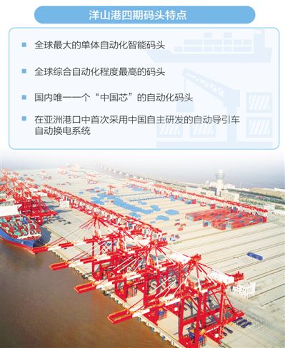 特別值得一提的是,洋山港四期碼頭全部由中國制造,擁有完全自主知識產(chǎn)權(quán)。洋山港四期碼頭采用振華重工制造的自動化裝卸設(shè)備,整個裝卸過程所涉及的橋吊、自動導(dǎo)引車、軌道吊三大機(jī)種均為中國制造。軟件系統(tǒng)也是由上港集團(tuán)和振華重工共同完成。