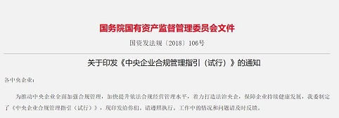 11月2日,國務(wù)院國資委印發(fā)了《中央企業(yè)合規(guī)管理指引(試行)》,推動中央企業(yè)全面加強(qiáng)合規(guī)管理,加快提升依法合規(guī)經(jīng)營管理水平,著力打造法治央企,保障企業(yè)持續(xù)健康發(fā)展。