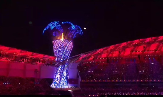 ▲第七屆世界軍運(yùn)會開幕式點(diǎn)燃圣火后的火炬塔