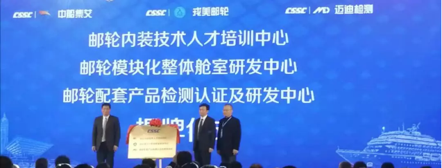 ????為解決我國郵輪配套產(chǎn)品認(rèn)證難、艙室系統(tǒng)技術(shù)水平落后、專業(yè)人才匱乏等問題,在中船郵輪和中國船舶集團(tuán)所屬中船九江海洋裝備(集團(tuán))有限公司的指導(dǎo)下,中國船舶集團(tuán)所屬中船集艾郵輪科技發(fā)展(上海)有限公司聯(lián)合中國船級社和上海工程技術(shù)大學(xué)成立了《郵輪配套產(chǎn)品測試認(rèn)證及研發(fā)中心》、《郵輪模塊化整體艙室研發(fā)中心》和《郵輪內(nèi)裝技術(shù)人才培訓(xùn)中心》,并在會上正式揭牌。