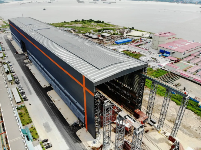 ????相較于露天船臺(tái),室內(nèi)船臺(tái)不僅能改善造船生產(chǎn)環(huán)境、提升產(chǎn)品建造質(zhì)量,還能解決長期困擾生產(chǎn)的雨季問題。