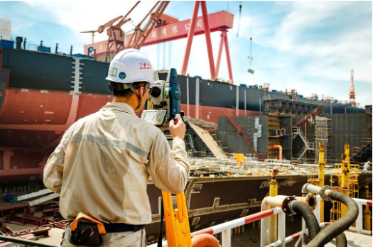 近40度的高溫天氣下,一位造船精度人堅(jiān)守崗位,使用全站儀監(jiān)控船塢每個(gè)搭載總段的定位精度,保障一次搭載到位。
