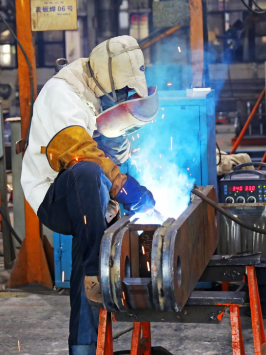 在38℃的高溫下,“蒙面焊將”堅(jiān)守工作崗位,用手中的焊槍把滿身的汗水化為激情與焊花一起綻放。