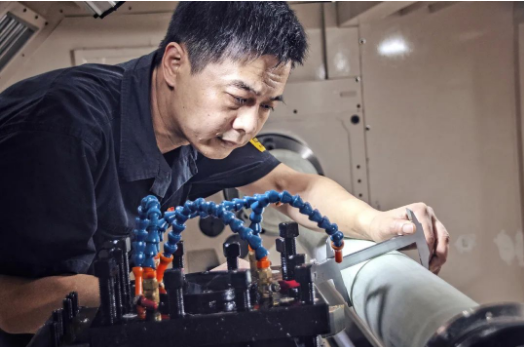 七〇八所海迅公司生產(chǎn)部的員工計(jì)師傅雖已汗如雨下,仍專注于銑床加工之中。