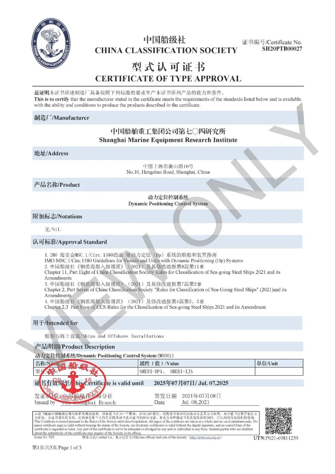 8月5日,中國船舶集團七〇四所動力定位控制系統(tǒng)(DP系統(tǒng))獲中國船級社(CCS)授予的國產(chǎn)化型式認可證書。該所成為國內(nèi)第一家滿足CCS2021年最新《鋼質(zhì)海船入級規(guī)范》要求的動力定位控制設備及系統(tǒng)供應商。