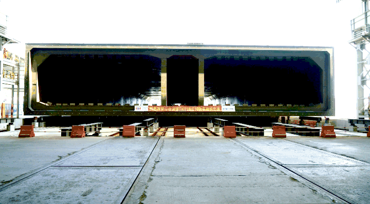 E15管節(jié)鋼殼于8月23日過駁交運(yùn)。緊接著,E16管節(jié)鋼殼于8月24日完成縱移,于9月24日通過廠內(nèi)聯(lián)合驗(yàn)收,從縱移到完成交付僅用時(shí)1個(gè)月,創(chuàng)造了目前為止的最短周期紀(jì)錄。