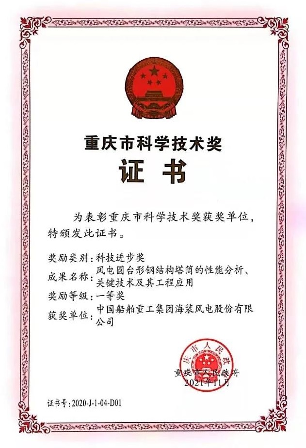 中國船舶集團(tuán)旗下中國海裝申報(bào)的兩項(xiàng)成果《高效安全大型風(fēng)電機(jī)組傳動鏈關(guān)鍵技術(shù)與應(yīng)用》《風(fēng)電圓臺形鋼結(jié)構(gòu)塔筒的性能分析、關(guān)鍵技術(shù)及其工程應(yīng)用》榮獲重慶市科技進(jìn)步獎一等獎。
