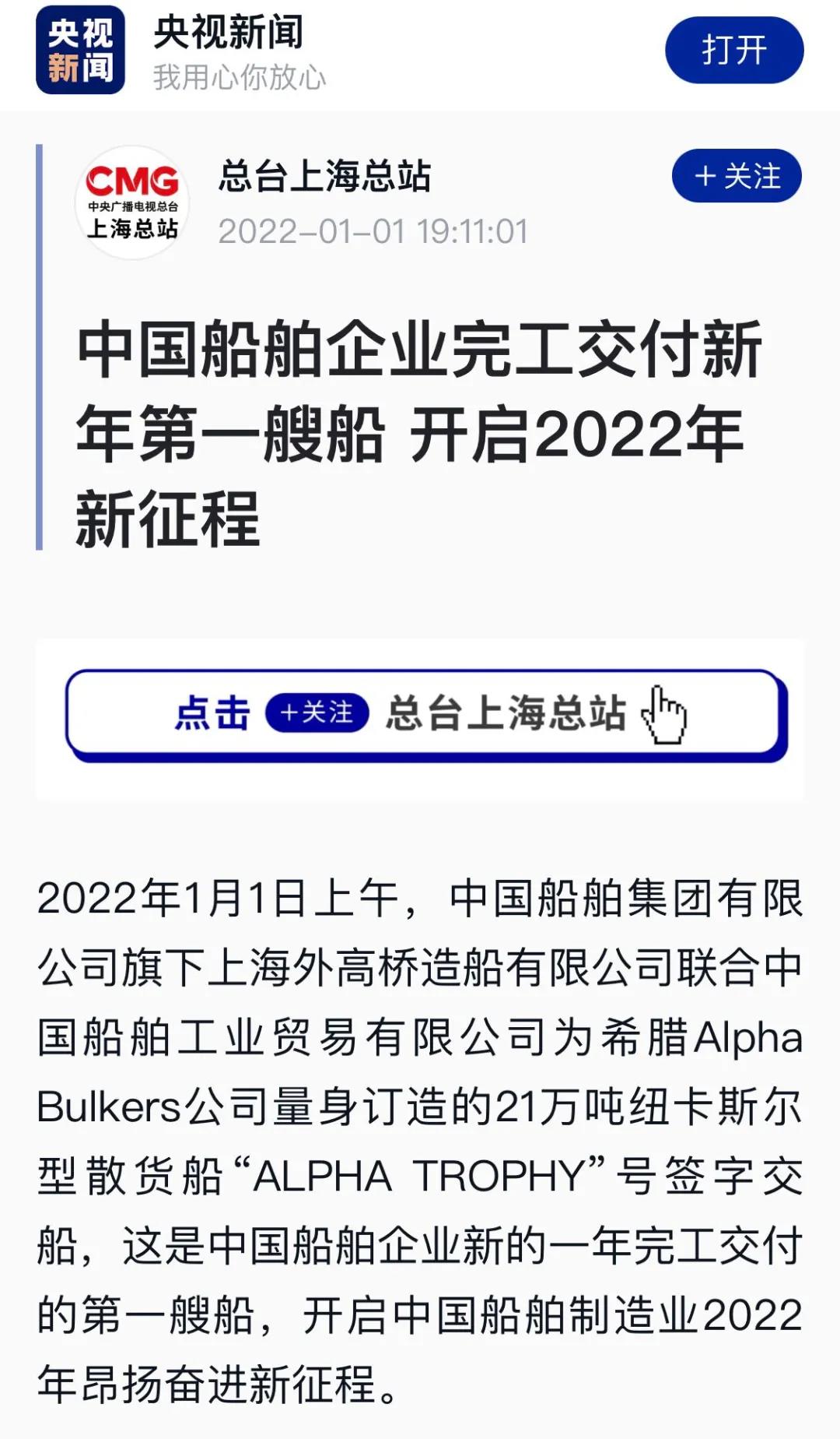 1月1日上午,中國(guó)船舶集團(tuán)旗下外高橋造船聯(lián)合中船貿(mào)易建造的21萬(wàn)噸紐卡斯?fàn)栃蜕⒇洿癆LPHA TROPHY”號(hào)簽字交船,這是中國(guó)船舶企業(yè)新的一年完工交付的第一艘船,開(kāi)啟中國(guó)船舶制造業(yè)2022年昂揚(yáng)奮進(jìn)新征程。