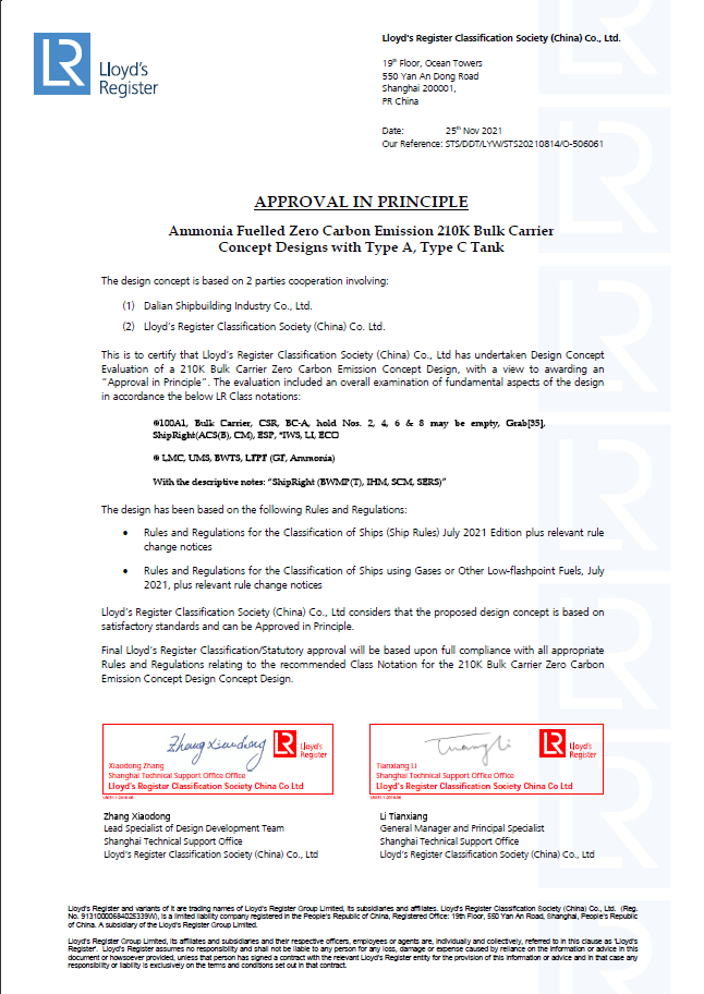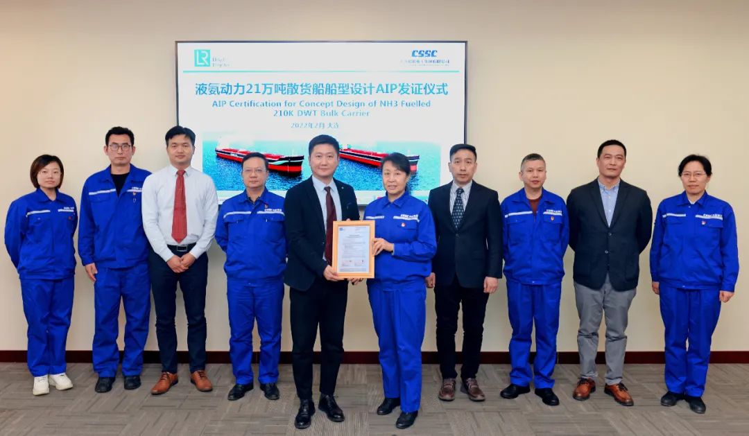 2月25日,中國船舶集團(tuán)旗下大船集團(tuán)最新研發(fā)的液氨動(dòng)力21萬噸散貨船設(shè)計(jì)方案,獲英國勞氏船級(jí)社(LR)原則性認(rèn)可(AIP)證書。
