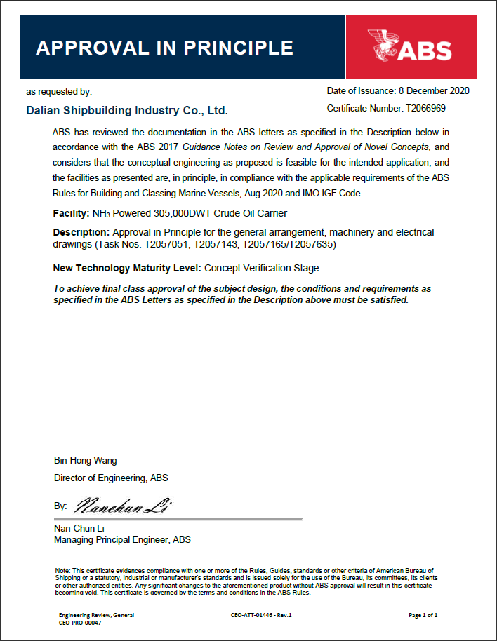 2020年,大船集團(tuán)研發(fā)的液氨動(dòng)力超大型油船(VLCC)分別取得美國船級(jí)社(ABS)和中國船級(jí)社(CCS)頒發(fā)的AIP證書。