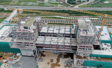 101#總部研發(fā)大樓是湛江灣實驗室一期項目的核心工程,其上部重達1.8萬噸的主體結構由53.4米跨度的轉換桁架承托。該轉換桁架是世界現(xiàn)有的第二大跨度轉換結構,同時與轉換桁架兩端相連的雙層鋼板剪力墻核心筒也是實現(xiàn)該建筑結構設計的關鍵部位。