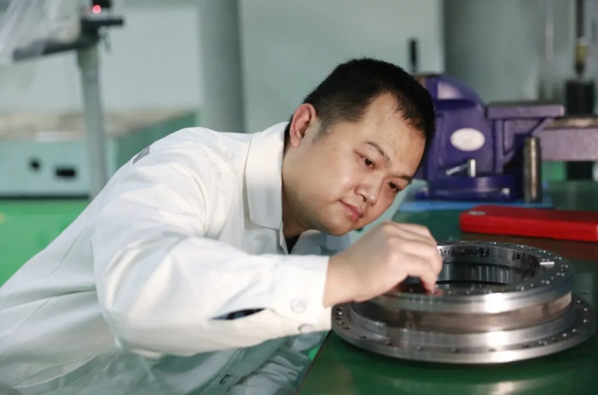 “必須持之以恒地以精益求精、精雕細(xì)琢的工匠精神打造所經(jīng)手的每個產(chǎn)品!”這是周虎常提的一句話。燃?xì)廨啓C(jī)機(jī)匣零組件制造精度要求高,裝配質(zhì)量控制嚴(yán),其加工、裝配工藝技術(shù)代表機(jī)械制造行業(yè)的先進(jìn)水平。武漢船機(jī)首套燃?xì)廨啓C(jī)機(jī)匣產(chǎn)品裝配工作由周虎帶領(lǐng)班組成員進(jìn)行,其高超的技能水平保障了產(chǎn)品的裝配質(zhì)量與進(jìn)度。在25兆瓦燃?xì)廨啓C(jī)過渡段機(jī)匣葉片裝配過程中,因葉片與機(jī)匣外環(huán)裝配為燕尾槽式的榫接結(jié)構(gòu),葉片榫頭與燕尾榫槽三面的接觸面積要求高達(dá)80%以上,需由鉗工拂配以達(dá)該指標(biāo)。葉片榫頭拂配過程中,周虎采用銼刀銼削裝配面,利用其長期磨練掌握的良好手感,將銼削量誤差控制在0.005-0.01毫米,大大減少了葉片試裝配次數(shù),裝配效率顯著提升。