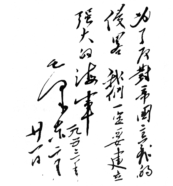 1953年2月19日,毛澤東在武漢登上長江艦視察長江中下游四省,并在長江艦上為海軍題詞:“為了反對(duì)帝國主義的侵略,我們一定要建立強(qiáng)大的海軍?!贝葱兄聊暇?,毛澤東提出要在南京檢閱海軍戰(zhàn)艦。華東海軍立即抽調(diào)了“廣州”號(hào)和“南昌”號(hào)護(hù)衛(wèi)艦、“黃河”號(hào)登陸艦,以及101號(hào)、104號(hào)魚雷艇參加檢閱。幾天中,毛澤東連續(xù)5次都寫下同樣的題詞:“為了反對(duì)帝國主義的侵略,我們一定要建立強(qiáng)大的海軍”。這是中國領(lǐng)導(dǎo)人對(duì)建設(shè)強(qiáng)大海軍、建設(shè)一流裝備的殷切期望,是新生的中國對(duì)建設(shè)強(qiáng)大海防的決心。如今這顆刻著偉人囑托的銘石,靜靜矗立在江南造船長興島造船基地行政樓前的草坪,也靜靜地矗立在每一位江南人的心中。