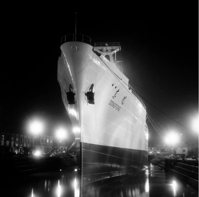 “一五”后期,研制萬噸級(jí)遠(yuǎn)洋貨船被列為國家新科技規(guī)劃的重點(diǎn)項(xiàng)目。在西方長期封鎖尤其是后來蘇聯(lián)中止援助的困難局勢(shì)下,“東風(fēng)”號(hào)是中國人首次嘗試自行設(shè)計(jì)、自行建造,全部采用國產(chǎn)設(shè)備的首艘萬噸遠(yuǎn)洋船。1960年4月15日,“東風(fēng)”號(hào)下水,時(shí)任上海市委書記陳丕顯、副市長曹荻秋等人出席下水典禮。萬噸輪被命名為“東風(fēng)”號(hào)。