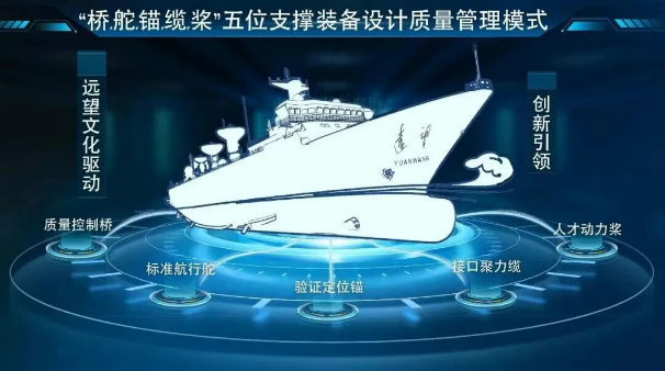 基于“全自主研發(fā)”和“巨系統(tǒng)抓總”的問題導(dǎo)向,七〇八所“遠(yuǎn)望”研發(fā)創(chuàng)新團(tuán)隊(duì)凝聚智慧和力量,以創(chuàng)新為引領(lǐng)、以遠(yuǎn)望文化為驅(qū)動,提煉了“橋、舵、錨、纜、槳”五位支撐裝備設(shè)計(jì)質(zhì)量管理模式。各項(xiàng)核心管理要素相互作用、五位支撐裝備研發(fā)設(shè)計(jì)過程,構(gòu)建形成了一個(gè)良好向上、持續(xù)提升的團(tuán)隊(duì)質(zhì)量管理機(jī)制,為確保裝備研制質(zhì)量奠定了堅(jiān)實(shí)基礎(chǔ)。“橋”是“艦橋”的簡稱,是艦船駕駛控制、觀察及決策的主要設(shè)施,其作用如同質(zhì)量控制。“舵”是控制艦船航行方向的主要設(shè)備,其作用如同規(guī)范指引?!板^”作為艦船停泊和定位的主要設(shè)備,其作用如同試驗(yàn)驗(yàn)證。“纜”作為艦船靠幫連接的主要設(shè)備,其作用如同接口管理。“槳”是提供艦船航行動力的主要設(shè)備,其作用如同人才保障。