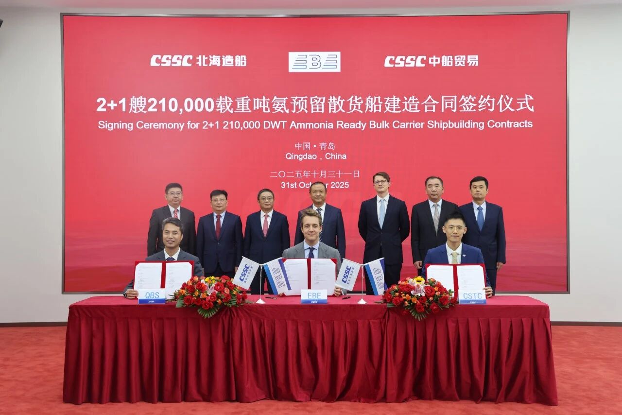 日前,中國船舶集團(tuán)有限公司旗下北海造船聯(lián)合中船貿(mào)易,與比利時航運(yùn)公司EBE成功簽署2+1艘21萬噸氨預(yù)留散貨船建造合同。此次合作是EBE公司首次在中國下單造船,體現(xiàn)了國際市場對北海造船建造實力的高度認(rèn)可。