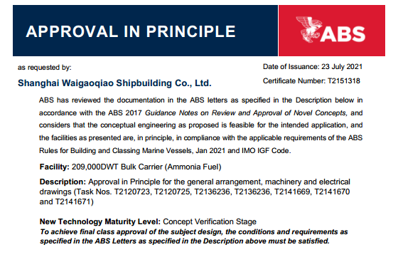 日前,中國船舶集團(tuán)旗下外高橋造船自主研發(fā)設(shè)計(jì)的21萬噸氨燃料動(dòng)力散貨船獲得美國船級社(ABS)頒發(fā)的原則性認(rèn)可證書(AIP)。作為具有潛力的零碳燃料,氨燃料能滿足更加嚴(yán)格的溫室氣體排放要求,是未來脫碳航運(yùn)業(yè)中最有希望的替代燃料之一。氨燃料動(dòng)力船型的推出,為航運(yùn)業(yè)提供一種零碳運(yùn)輸?shù)沫h(huán)保新方案。