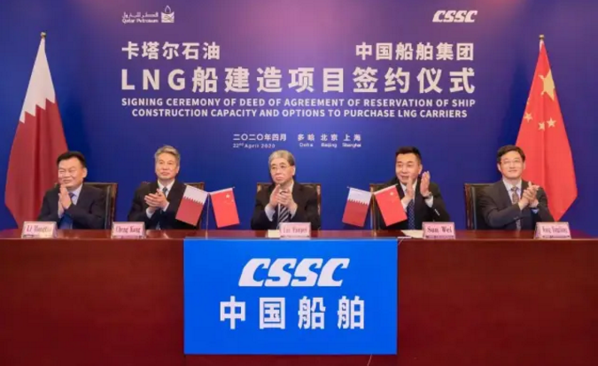 4月22日,中國船舶集團與卡塔爾石油公司簽署“中國船舶—卡塔爾石油液化天然氣(LNG)船建造項目”協(xié)議,所涉訂單總金額超過200億元人民幣。