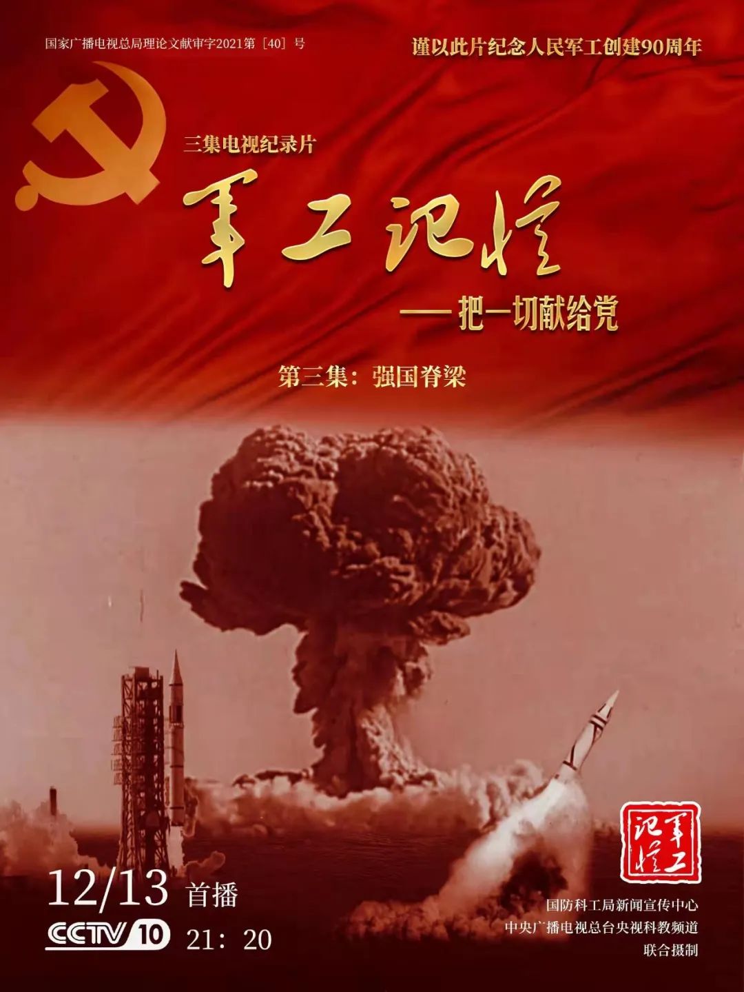 為慶祝中國共產黨成立100周年,紀念黨領導下的人民軍工創(chuàng)建90周年,由國防科工局指導,國防科工局新聞宣傳中心聯(lián)合中央廣播電視總臺社教節(jié)目中心攝制,各軍工集團大力支持的3集重大理論文獻電視紀錄片《軍工記憶——把一切獻給黨》,將于12月11日21:20在央視科教頻道(CCTV-10)《探索發(fā)現(xiàn)》欄目首播,連續(xù)播出3天。該紀錄片旨在向建黨百年獻禮,向人民軍工90周年致敬,向全社會弘揚軍工精神傳遞軍工文化,激勵國防科技工業(yè)戰(zhàn)線廣大干部職工不忘初心、接續(xù)奮斗,為實現(xiàn)強軍強國夢想貢獻力量。