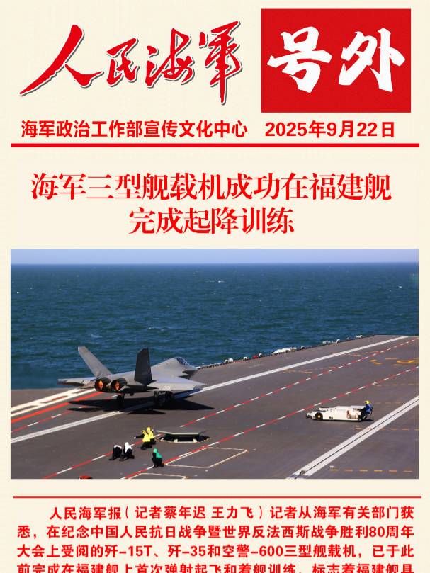 記者從海軍有關(guān)部門獲悉,在紀念中國人民抗日戰(zhàn)爭暨世界反法西斯戰(zhàn)爭勝利80周年大會上受閱的殲-15T、殲-35和空警-600三型艦載機,已于此前完成在福建艦上首次彈射起飛和著艦訓練,標志著福建艦具備了電磁彈射和回收能力。這是我國航母發(fā)展歷程中取得的又一次突破,對推進海軍轉(zhuǎn)型建設(shè)具有里程碑意義。